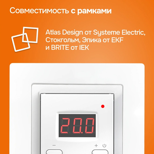 - рамка для терморегулятора, 2 адаптера для рамок Atlas Design, Эпика, Стокгольм, BRITE, Unica, Sedna и других с размером лицевой панели 45х45 и 55х55 мм;